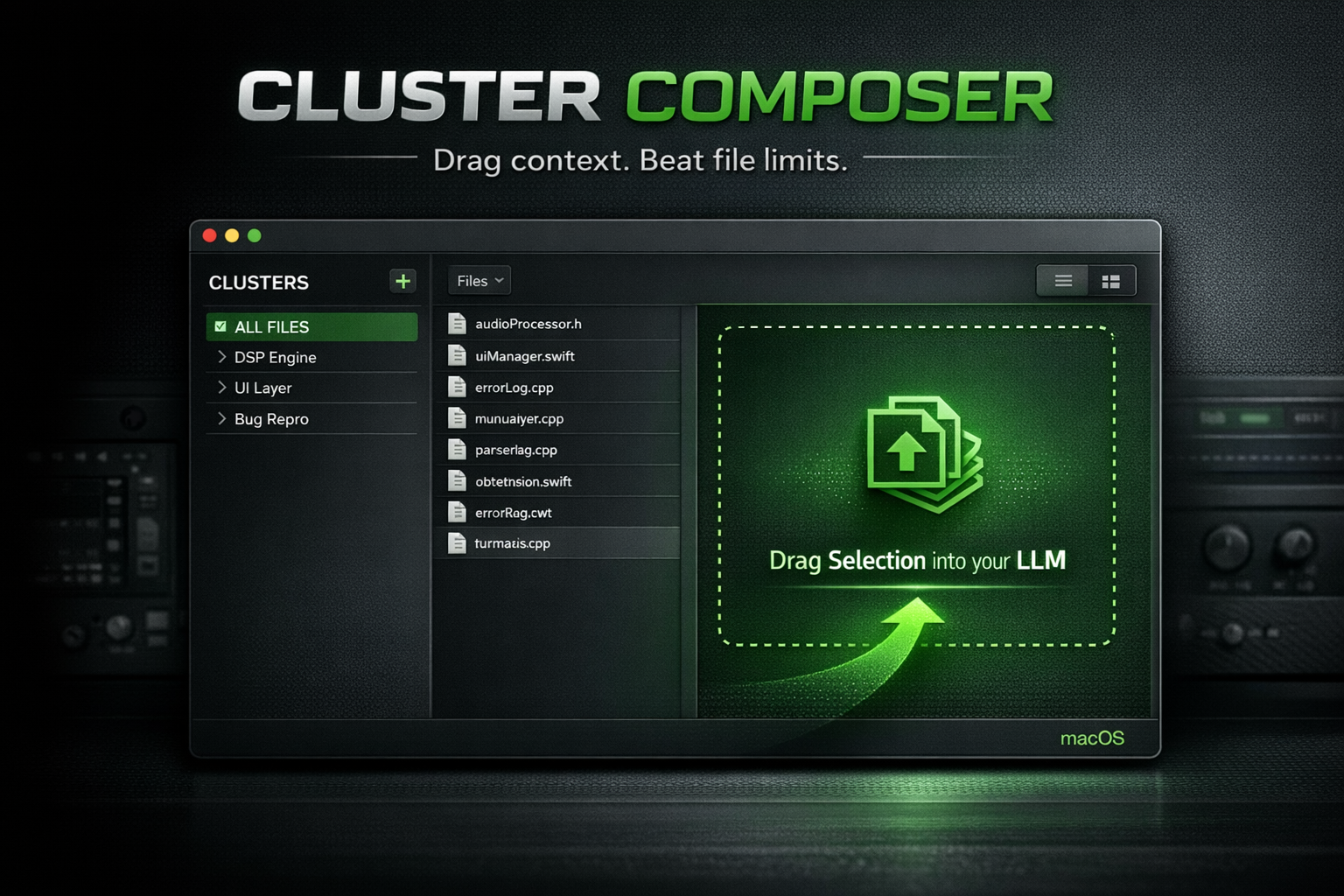 CLUSTER COMPOSER is a modern macOS dev utility that turns real projects into clean, LLM-ready context dumps.